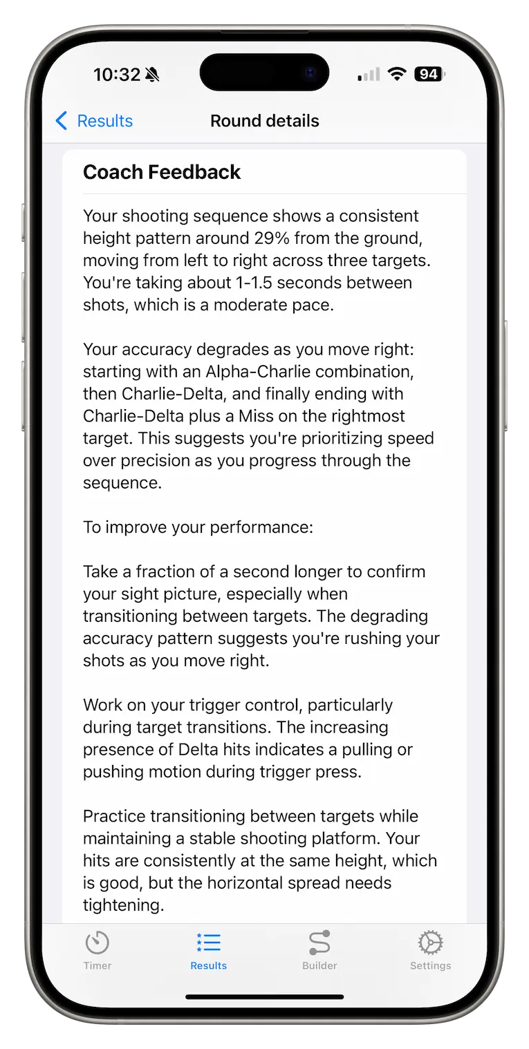 Get expert analysis and personalized feedback after every session, just like having a professional instructor by your side. Blast Buddy's AI coach analyzes your shooting timing patterns, target transitions, accuracy scores and overall stage execution.