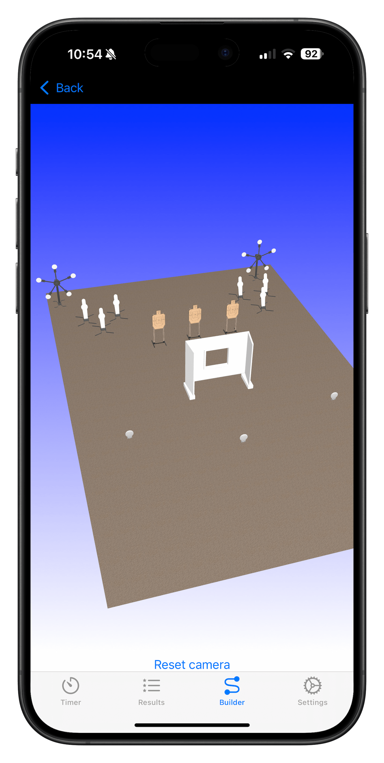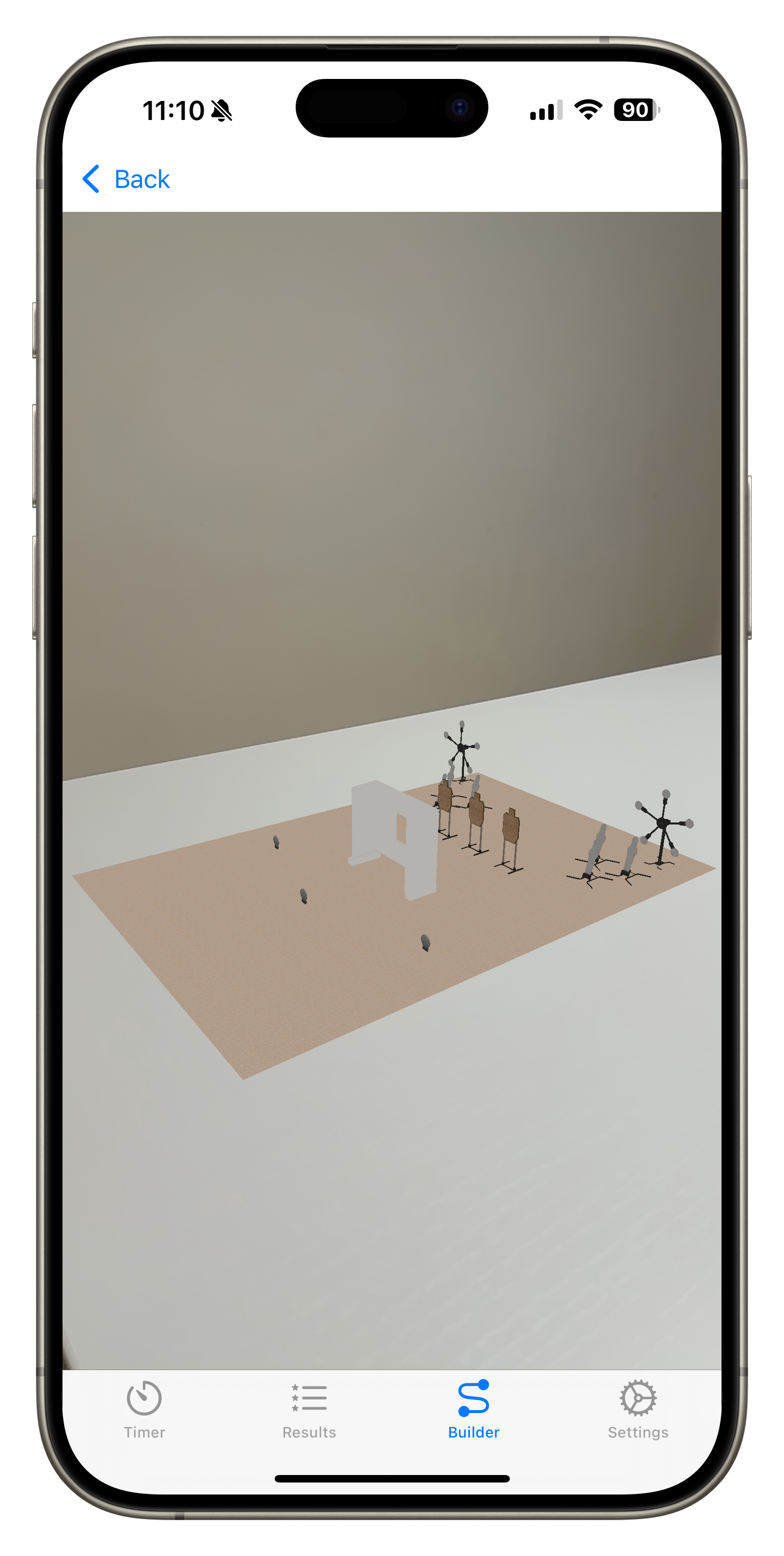 Step into your stage designs with iOS AR, and experience them at true 1:1 scale in your actual environment. Scale your stage with a pinch — from tabletop size for quick visualization to full competition dimensions for realistic walkthrough. Move naturally through your course of fire, checking sight lines and target placements exactly as they'll be on match day.