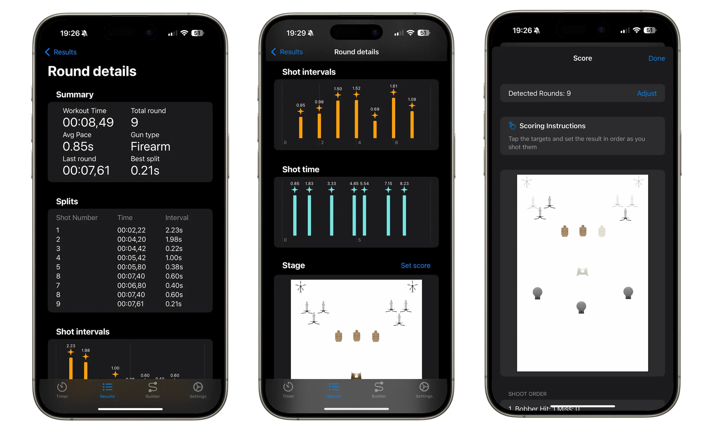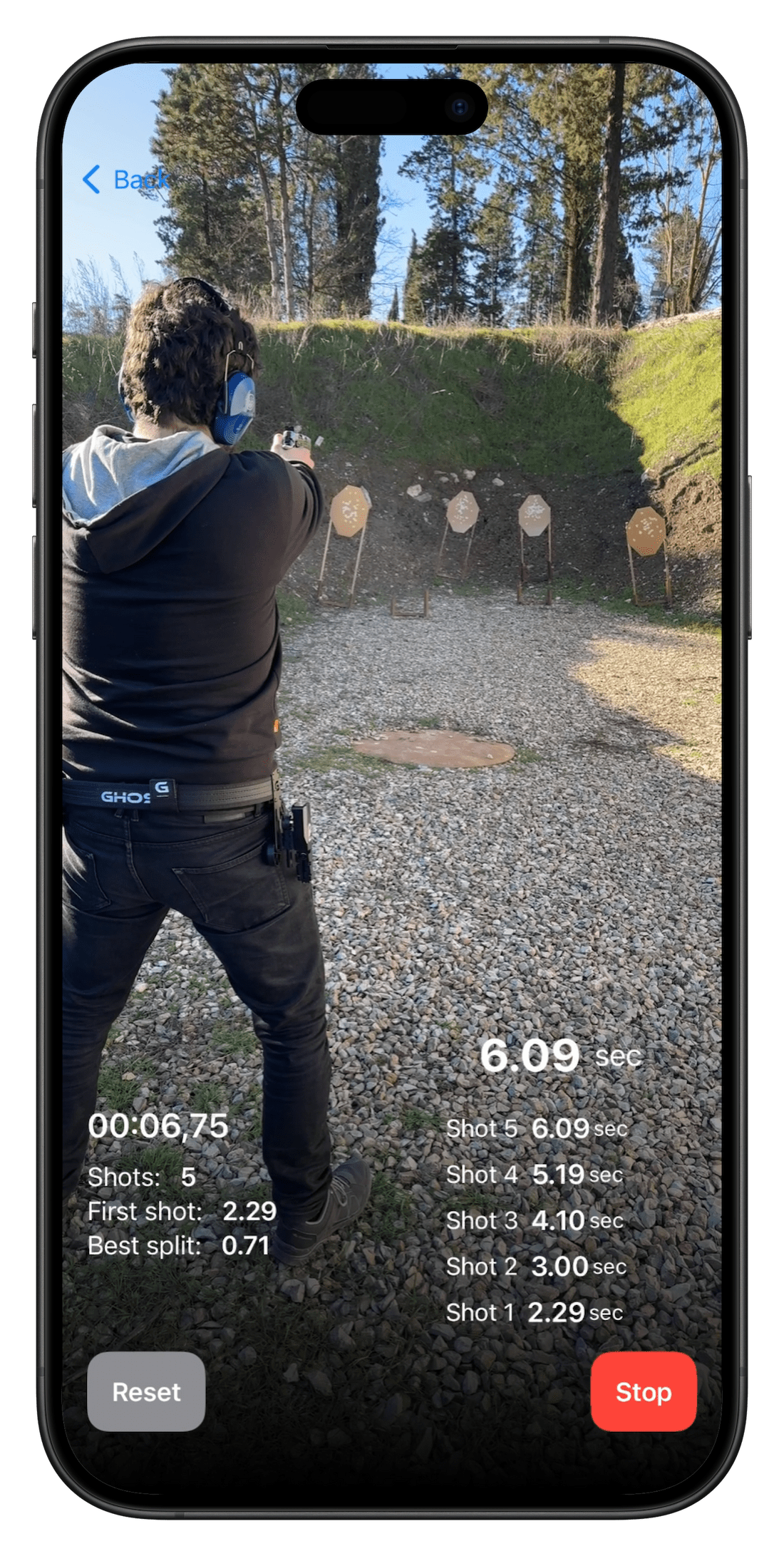 Capture your performance with precision timing overlays automatically embedded in your video. Watch your shots unfold with real-time stats including first shot time, split times, and total round count — all seamlessly recorded to your camera roll. Perfect for analyzing your technique or sharing your best runs.